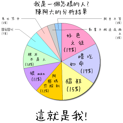 陳阿六的成份分析 好色之徒:17.1%嗜吃如命:16.9%猖狂:14.8%阿撘媽恐股利:11.7%很man:10.6%根本不是人:9.8%嘴砲:6.5%秀外慧中:5.2%勤奮不懈逆流而上:3.1%阿里不答:2.9%頭腦簡單:0.6%只有挨打的份:0.3%人云亦云:0.0%懶懶散散:0.0%純潔:0.0% 哈哈哈 我個人覺得那個好色跟嘴砲很準耶XDD